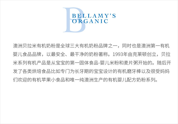 貝拉米系列寶寶營養輔食產品嚴格按照NASAA有機認證標準生產,不含任何的化學合成農藥和肥料,不含轉基因物質,采用科學配方,為寶寶成長發育提供均衡的營養。