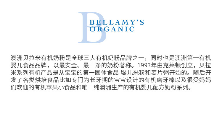 Bellamy's 貝拉米系列寶寶營(yíng)養(yǎng)輔食產(chǎn)品嚴(yán)格按照NASAA有機(jī)認(rèn)證標(biāo)準(zhǔn)生產(chǎn),不含任何的化學(xué)合成農(nóng)藥和肥料,不含轉(zhuǎn)基因物質(zhì),保證寶寶營(yíng)養(yǎng)安全,采用科學(xué)配方,為寶寶成長(zhǎng)發(fā)育提供均衡的營(yíng)養(yǎng)。