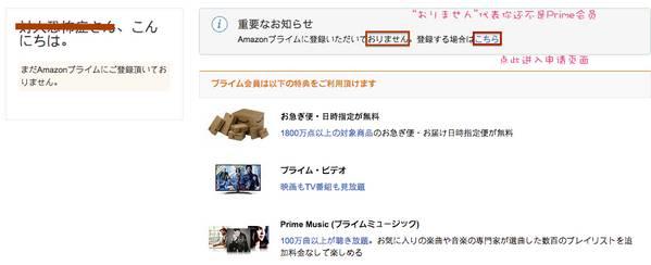 2、“おりません”代表你還不是Prime會(huì)員,可以直接點(diǎn)擊右側(cè)“こちら”進(jìn)入注冊(cè)頁(yè)面,也可回到首頁(yè),點(diǎn)擊左上角amazon.co.jp下面的プライム字樣進(jìn)入注冊(cè)頁(yè)面。