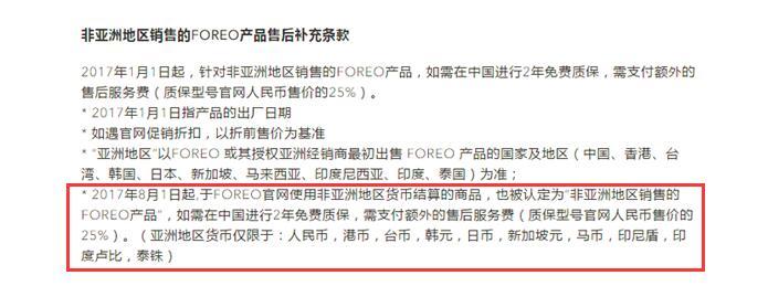 (2)非亞洲地區(qū)購買的任何Foreo產(chǎn)品的出廠日期是在2017年之后,在申請質(zhì)保是需要繳25%的費(fèi)用,就是不能免費(fèi)換新的;