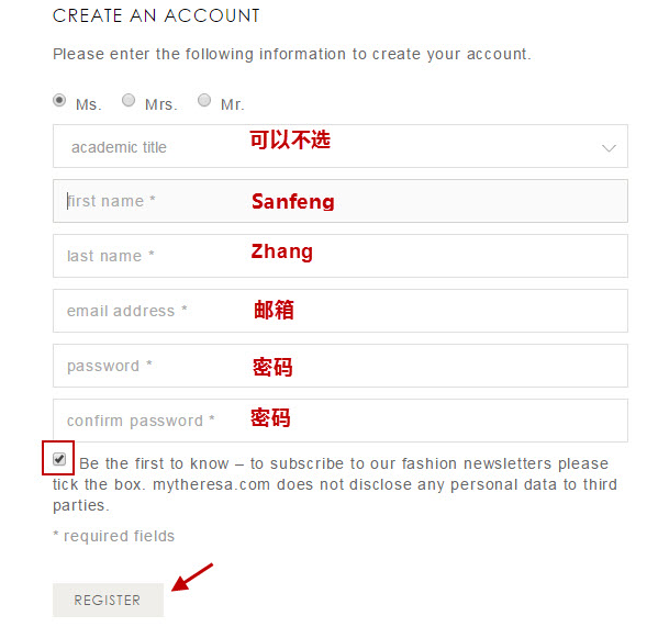 在這里填寫(xiě)您的稱呼、名、姓、郵箱和密碼等,勾選同意條款,最后點(diǎn)擊Register按鈕。