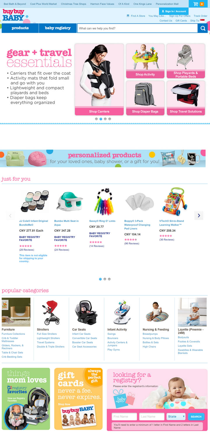 buybuy BABY是美國一個專營嬰幼兒用品的購物網站,主營嬰兒床、兒童櫥柜、床墊、床上用品、車載座椅、輔助座椅、手推車、兒童餐椅、奶粉、紙尿褲、玩具等嬰幼兒所需的一切商品。除了擁有種類齊全的嬰幼兒產品外,還提供無以倫比的優質售后服務。