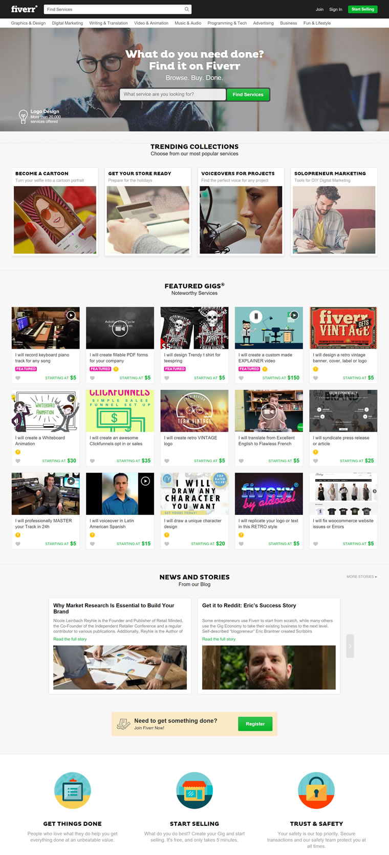 全球最大的服務市場,起價5美元。在Fiverr上銷售的服務包括創意服務、IT幫手、視頻專業人員、作家和翻譯、聲音編輯、商業顧問、網站開發人員等等。