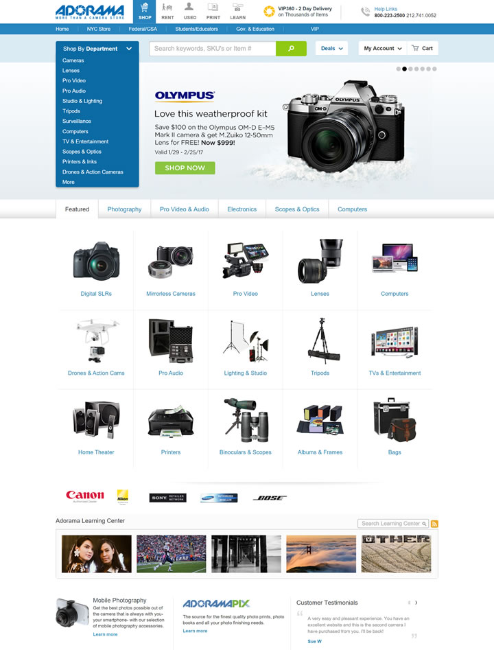 Adorama是美國一家以銷售攝影器材為主的電商,成立近40年,是專業銷售照相、影視器材和各類電子產品的經銷商,也是全美口碑最好的攝影器材類B2C之一。各種專門的影視器材均能找到,如混音器、攝影棚搭建設備、顯微攝像儀等。