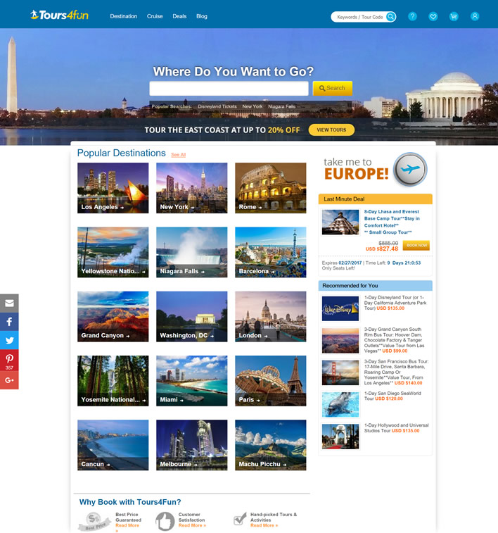 Tours4Fun成立于2006年,是一家正在蓬勃發(fā)展的線上旅行服務(wù)商,致力于提供最好的線上服務(wù)滿足您的旅行需求。我們的專(zhuān)業(yè)人員在全球范圍內(nèi)聯(lián)系值得信賴的當(dāng)?shù)毓?yīng)商來(lái)為您找到最佳且具性價(jià)比的旅行和活動(dòng)。由于我們極具戰(zhàn)略的合作,全球內(nèi)我們能提供超過(guò)85000家酒店的住宿折扣。滿足您旅途中的需要讓您可以全身心地享受旅途也是我們追求的一部分,現(xiàn)在我們的業(yè)務(wù)范圍已經(jīng)拓展到機(jī)場(chǎng)轉(zhuǎn)機(jī)服務(wù),停靠港旅行和旅行套餐等,保證低價(jià)和24/7的優(yōu)質(zhì)客戶服務(wù)。