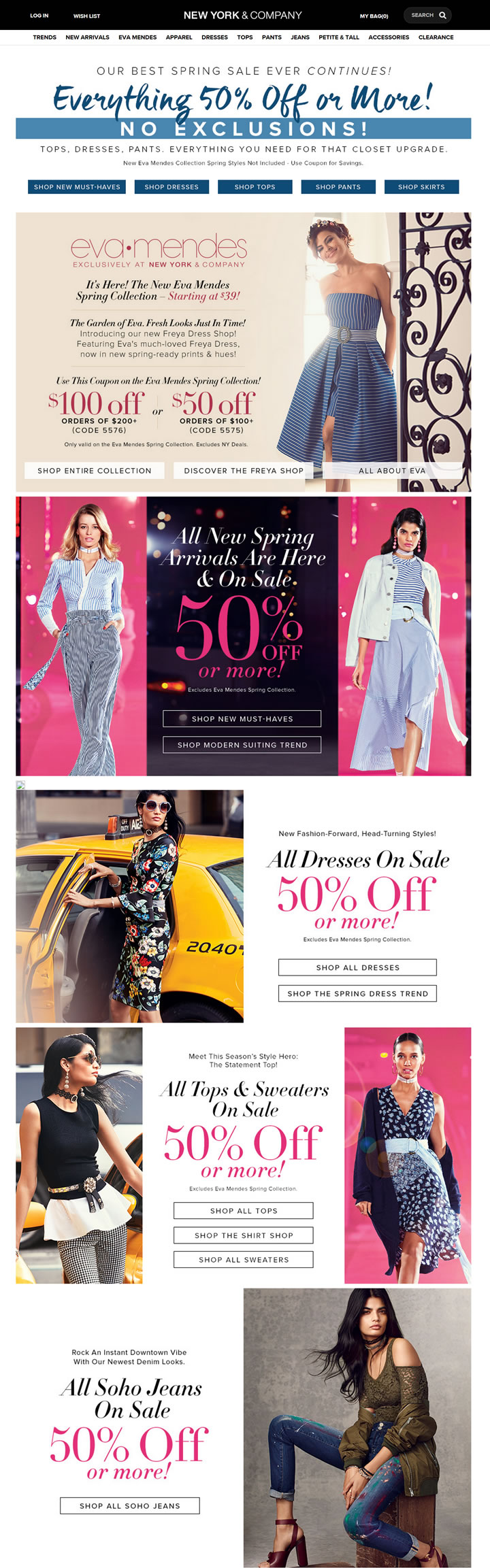 New York & Company是美國知名女性服飾品牌。品牌的理念是讓女性看起來更好,讓她們覺得自信,時尚,有吸引力。該品牌的產品只在500家專賣店折扣店以及官網銷售。這家服裝公司成立于1918年并且于2004年上市,總部設在紐約市。