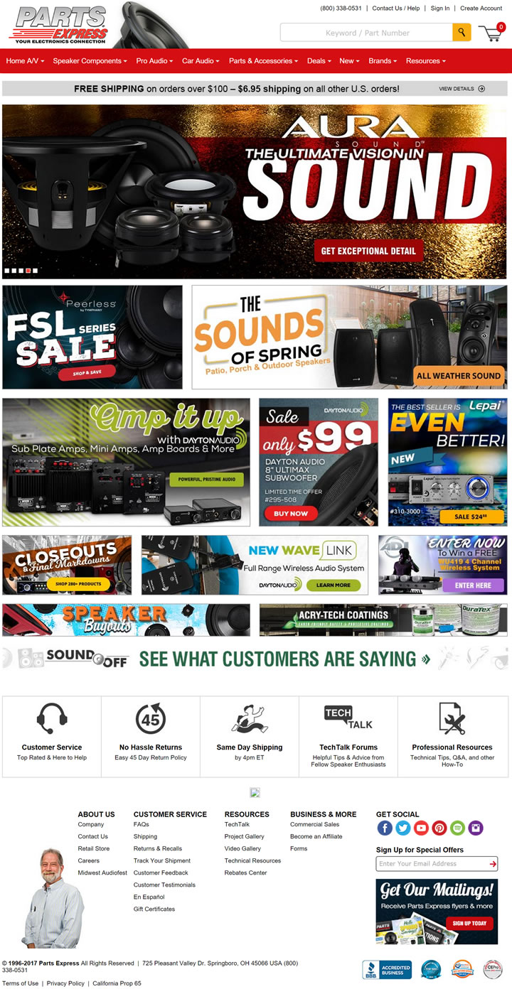 Parts Express自1986年以來一直為音頻/視頻行業提供電子零件和配件。我們為客戶(從音響技術人員到音響愛好者)提供最好的音頻和視頻零件,高折扣的價格 。 Parts Express公司的辦公室和倉庫位于俄亥俄州斯普林伯勒市的一個12萬平方英尺的設施,距離辛辛那提以北約25分鐘。