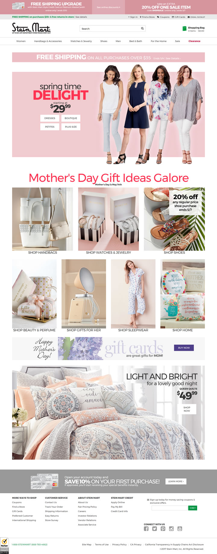 Stein Mart是一家總部設在佛羅里達州杰克遜維爾市的美國男女折扣服飾百貨連鎖店。該公司2013年的利潤為2560萬美元,在29個州有260家商店。Stein Mart主要位于東南部和德克薩斯州。Stein Mart商店擁有男女最新服裝趨勢。 此外,家庭裝飾、配件和鞋子都以優(yōu)惠價格提供。