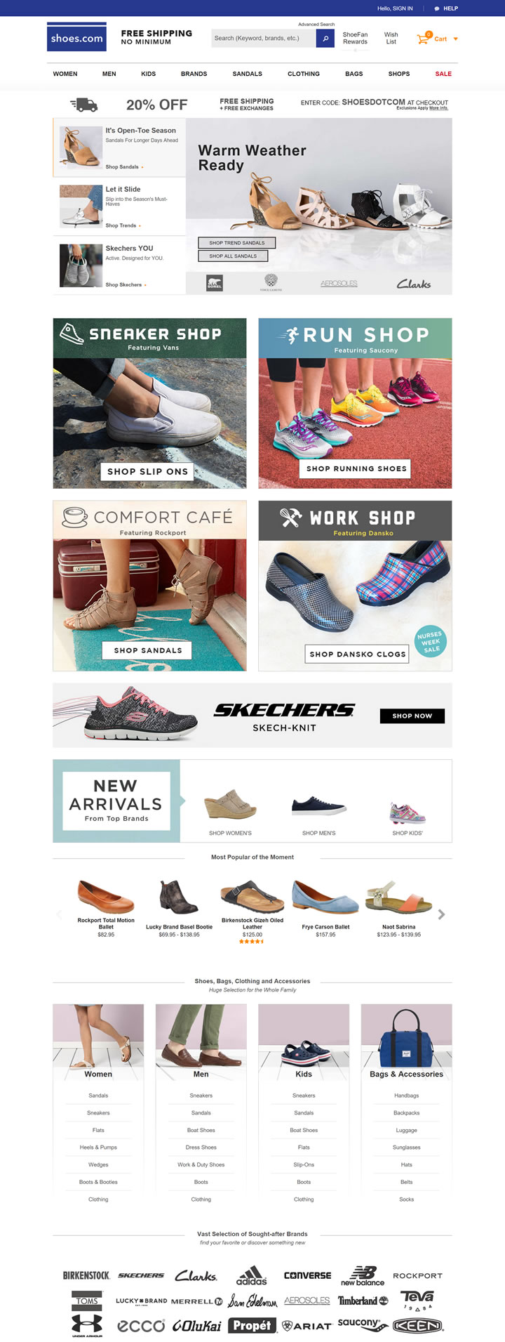 Shoes.com是互聯(lián)網(wǎng)上最大的鞋類及相關(guān)服裝零售商。Shoes.com與900多個(gè)廠商的建立伙伴關(guān)系,產(chǎn)品有70多萬(wàn)種,包括阿迪達(dá)斯、艾倫、埃德蒙茲、英國(guó)其樂(lè)、鱷魚、愛步、斐樂(lè)、等世界頂級(jí)品牌。因其杰出服務(wù)而連續(xù)六年被BizRate評(píng)為美國(guó)頂級(jí)eTailers,而只有兩家企業(yè)連續(xù)六獲此殊榮;并被Hitwise評(píng)為網(wǎng)上十大訪問(wèn)量最大的服裝及配飾分類商業(yè)網(wǎng)站。