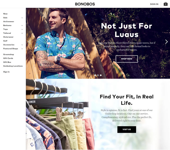 Bonobos是來自美國的服裝品牌。它是美國購物網站上最大的服裝品牌。Bonobos的核心宗旨是讓每位客戶擁有世界上最好的網上購物體驗。