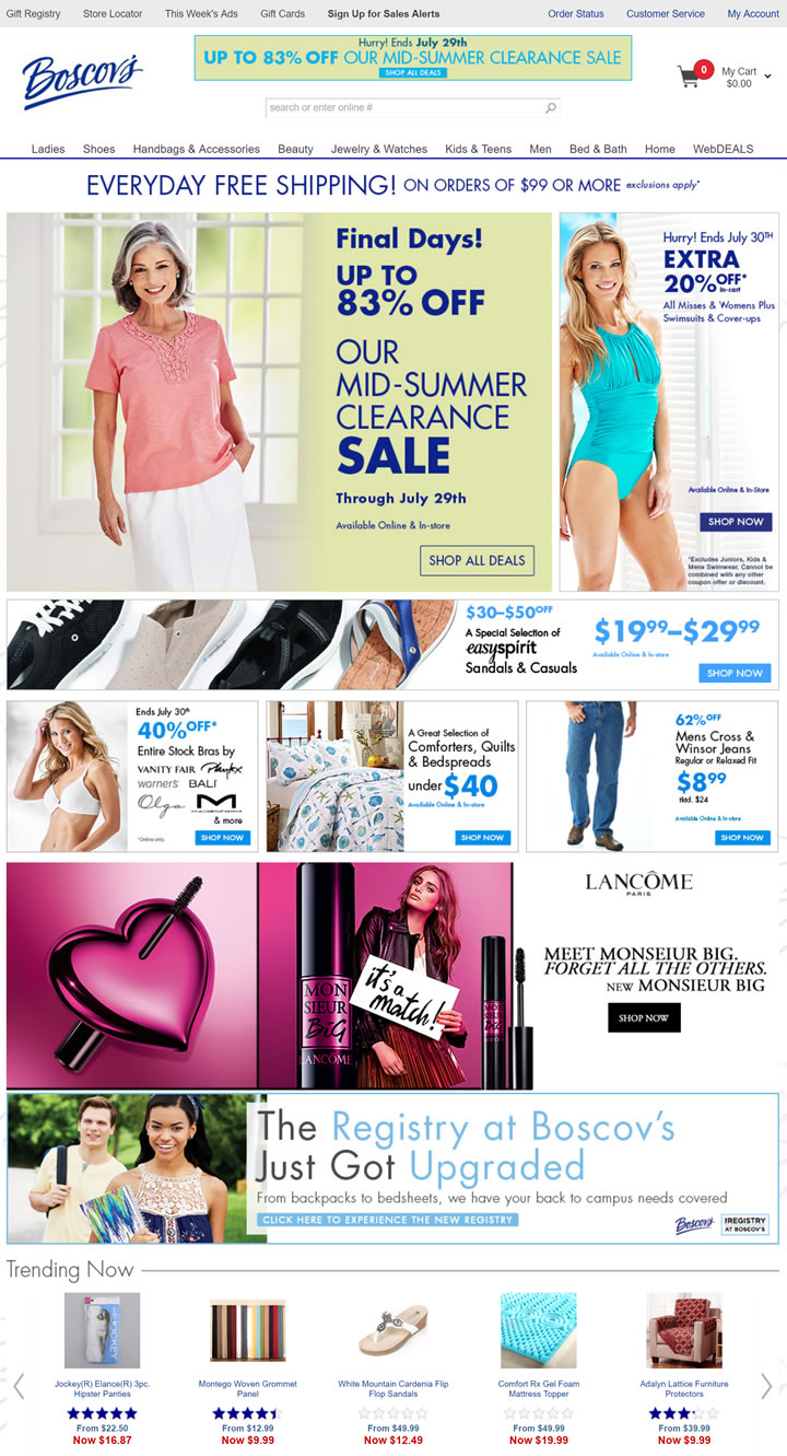 Boscov’s是美國一家知名的家庭連鎖百貨商店。它致力于為消費者帶來一系列知名品牌的商品,為來自全球的消費者打造方便、快捷的購物體驗。它銷售的產品主要包括:女士服裝、鞋履、包包、美妝、珠寶首飾、玩具、兒童服裝及男士服裝等。Boscov’s Department Stores銷售的產品中有眾多知名品牌,比如:Adidas、Calvin Klein、Clinique、Levi’s、Lenox等。