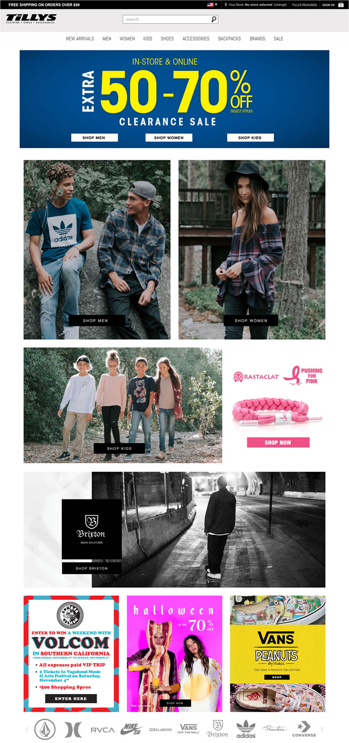 Tillys是一個(gè)深深扎根運(yùn)動(dòng)世界的生活品牌,沖浪、滑板、賽車、音樂(lè)、藝術(shù)、時(shí)尚、文化同住一個(gè)屋檐下。自1982年以來(lái),Tillys一直是全球時(shí)尚生活方式愛好者的首選目的地。我們自豪地?fù)碛蠽olcom、Hurley、RVCA、Vans、O’Neill、Roxy、Quiksilver、Billabong、Levi’s、UGG、Nike SB、JanSport、Nixon等品牌。