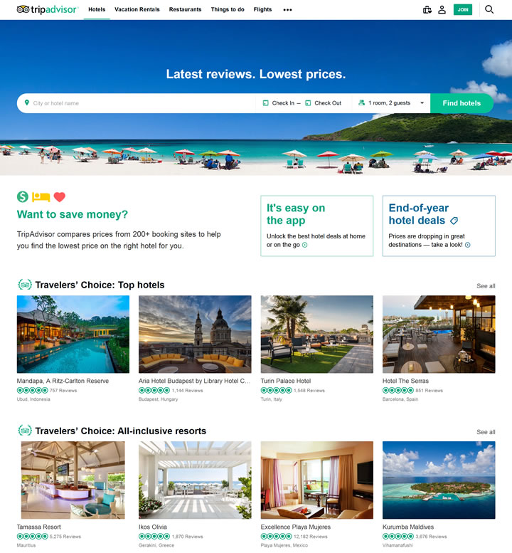 Tripadvisor是全球最大最受歡迎的旅游社區,也是全球第一的旅游評論網站。每月獨立訪問量達3.4億人,同時擁有超過7800萬的注冊會員以及超過2億條旅游點評和評論,并且數量還在不斷增加中。旅行者的真實評論是TripAdvisor最大的特點。目前TripAdvisor已成為一個大型的在線“數據庫”,它擁有大量關于旅游目的地的信息,包括酒店、景點、餐廳。