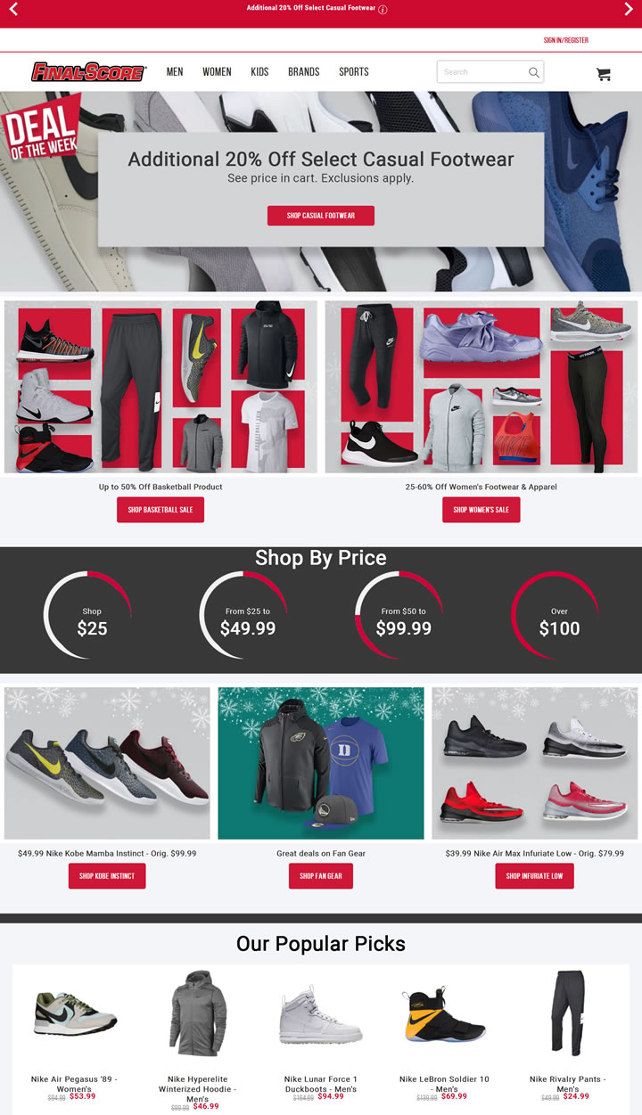 美國最大的體育用品零售商Foot Locker旗下的在線運動用品銷售商店。經過多年發展,Final-Score是Eastbay的延伸品牌,已經是美國最大的在線銷售運動鞋、潮流服飾、經過授權的職業隊運動裝的購物網站,銷售包括耐克、阿迪達斯、銳步、新百倫等眾多知名品牌,客戶遍布全世界。