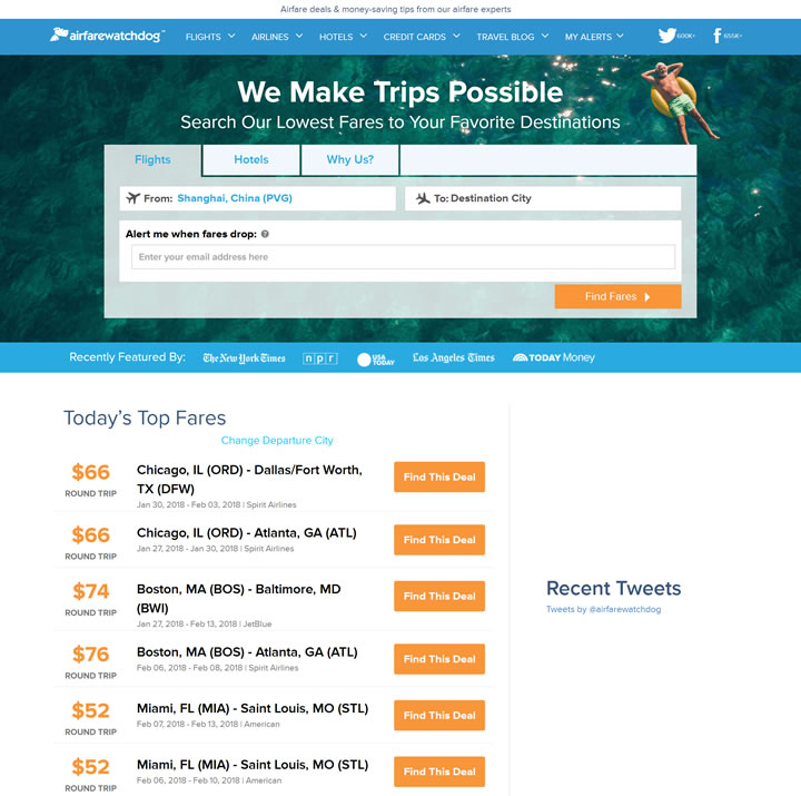 Airfarewatchdog.com是一家智能旅游媒介網絡,不同于其余的旅游票務預訂比價網站,Airfarewatchdog.com更加注重質量而不是數量,網站只列出值得選購且性價比高的票務,是一個更加人性化的比價網站。