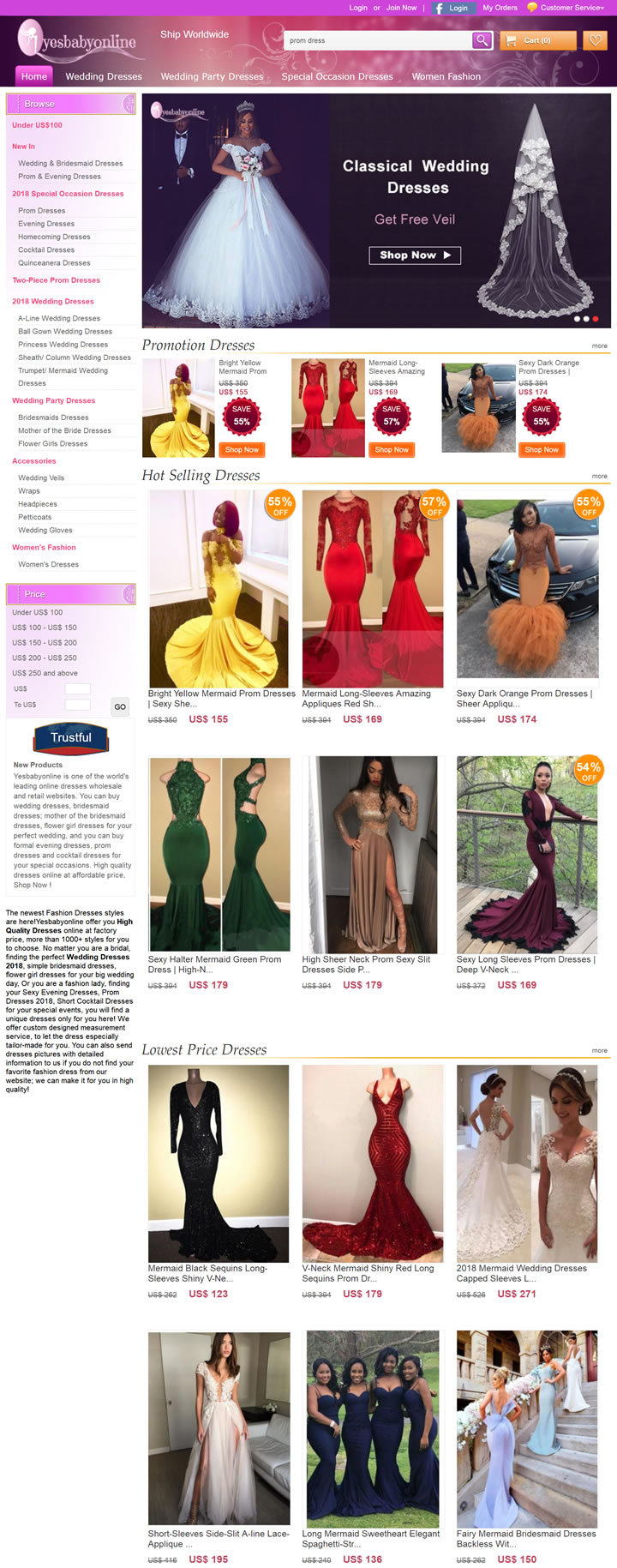 YesBabyOnline是一家全球性的在線婚紗禮服和特殊場合禮服工廠,自2010年開始運營。該店以合理的價格提供最新款式的新娘禮服、伴娘禮服、舞會禮服、晚禮服和返校節禮服,并提供定制尺寸和顏色,全球航運。