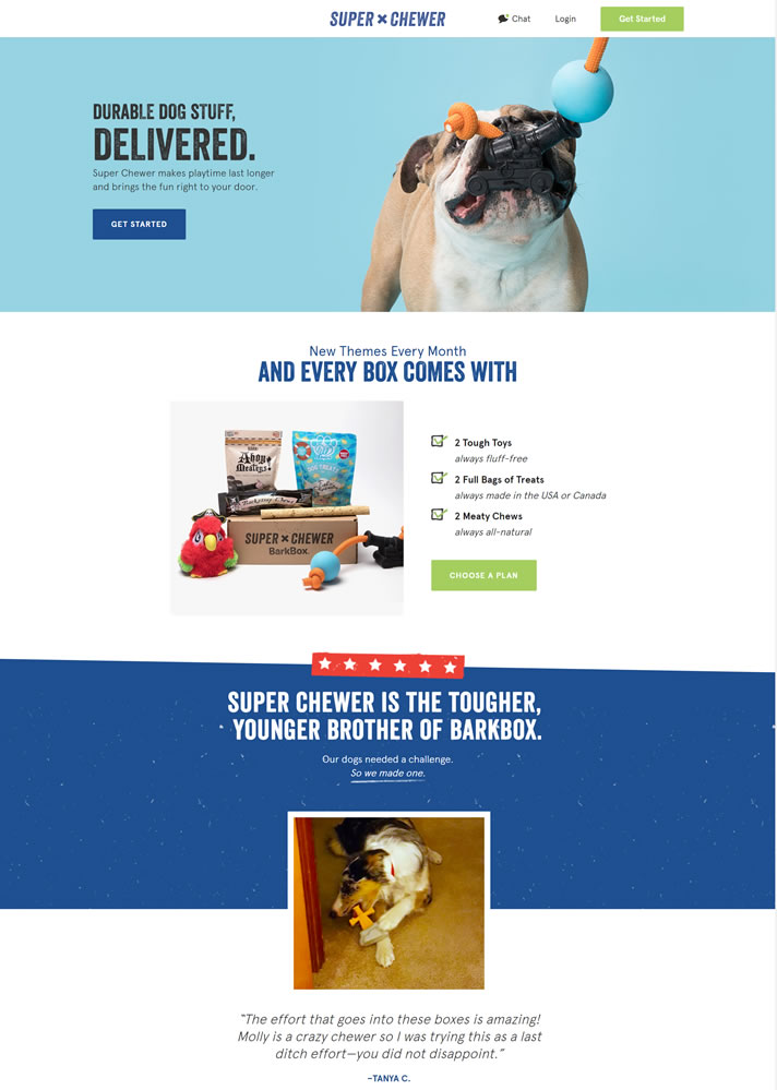 Super Chewer提供狗狗玩具、零食和咀嚼物的月度送貨服務(wù),送到您家門(mén)口。為您的幼犬提供最具挑戰(zhàn)性的玩具破壞!
