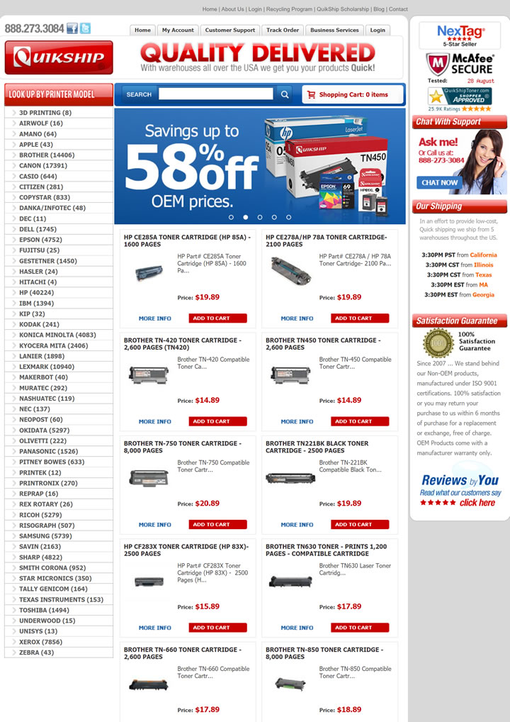 在QuikShip Toner,我們的使命是快速為您提供優質的打印機產品。我們努力以最便宜的價格提供種類繁多的可靠產品,為客戶提供最佳價值。無論您是在尋找墨水、碳粉還是各種打印機零件或耗材,我們都能滿足您的需求。