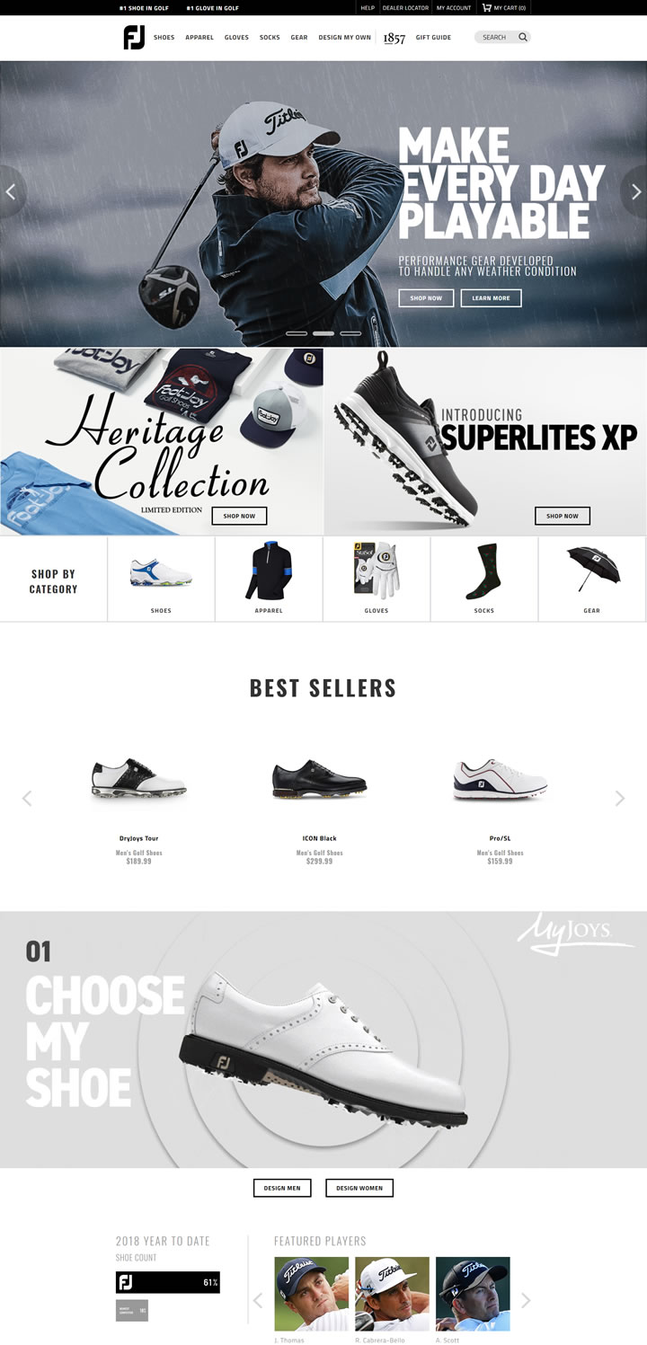 FootJoy致力于打造卓越的高爾夫球鞋、手套和配件,提升您的球場體驗。FootJoy是那些熱愛這項運動的人的選擇,從年輕人到老年人,從業(yè)余愛好者到頂級專業(yè)人士。60多年來,F(xiàn)ootJoy一直是PGA巡回賽中領(lǐng)先的高爾夫球鞋。