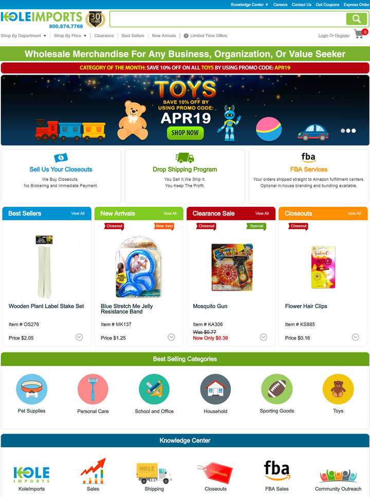 30多年來,Kole Imports一直是美國最大的一般商品直接進口商之一,以批發價格向廣泛的客戶提供產品,包括店面的非營利組織或任何希望以批量形式購買的客戶。Kole Imports提供數百種不同類別的數千種產品,如寵物用品、汽車用品、玩具等,保證您能以批發價格找到所需產品。Kole Imports不僅進口產品,而且我們積極尋求和購買國內的收尾,為我們的客戶提供每日更換的動態產品,因此您需要經常查看。
