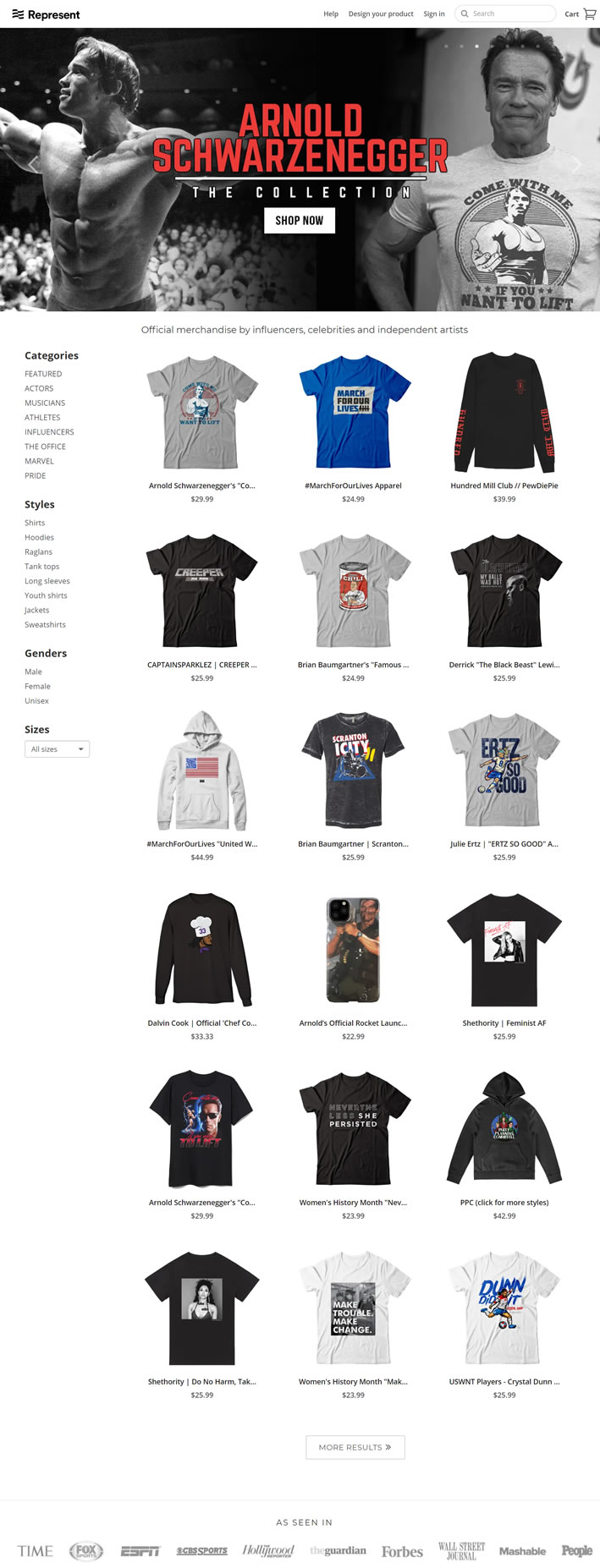 Represent與世界頂級的演員,運動員,音樂家等明星,影視IP合作,制作官方周邊商品出售。客戶包括漫威系列, Kobe Bryant,Arnold Schwarzenegger,Ice Cube,PewDiePie,Lionel Messi,Ronda Rousey,Kevin Hart,Mark Tuan,Matthew Mcconaughey和Leonardo DiCaprio等。 這些名人和有影響力者中的許多人都使用Represent作為其首選慈善機構籌集資金的一種方式。提供的典型商品包括T恤,運動衫,帽衫,帽子,包,海報和大頭針等。