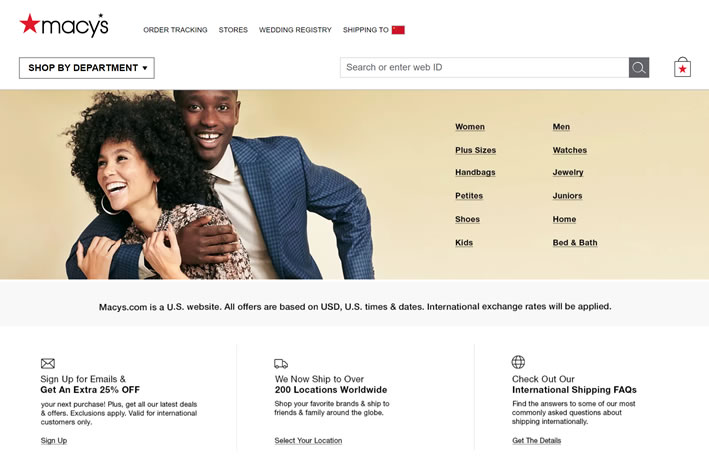 梅西百貨官網,購買服裝、配件、珠寶、美容、鞋和家居產品。Macy’s(梅西百貨),美國著名的連鎖百貨公司,其旗艦店位于紐約市海諾德廣場(Herald Square),號稱是“世界最大商店”。 梅西百貨主要經營服裝、鞋帽和家庭裝飾品,以優質的服務贏得美譽,在美國和世界有很高的知名度。