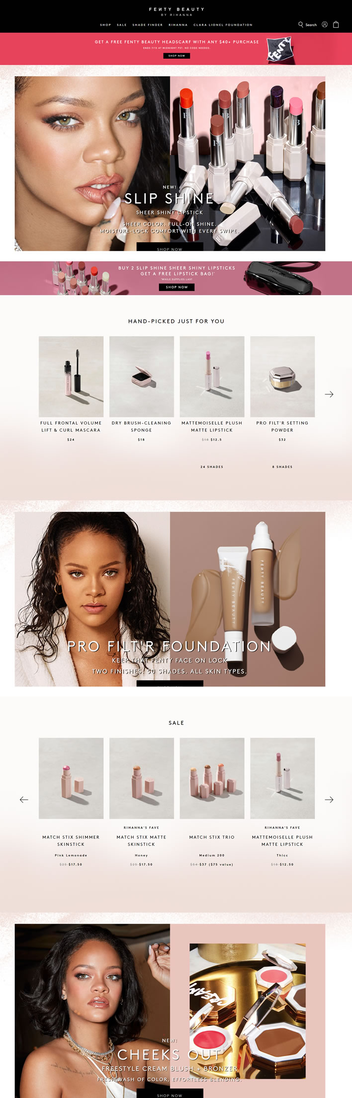 蕾哈娜(Rihanna)創立的Fenty Beauty致力于為所有女性提供包容性。通過為所有膚色提供無與倫比的色調和顏色,您將永遠不會在別處尋找美容產品。瀏覽粉底、唇膏等。