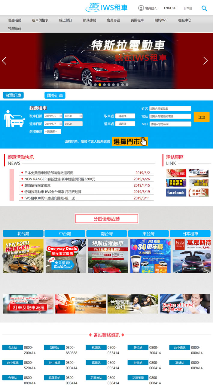 IWS艾維士小客車臺灣租車首選品牌,提供您平價專業短期租車、長期租車服務!我們在臺北、桃園、新竹、彰化、臺中高鐵機場、嘉義、臺南、高雄、臺東和花蓮皆有租車服務據點。手續簡便、不押證件、信用卡付費、甲租乙還,并可線上預訂各式車種,滿足您因商務或旅游租車之需求。服務好每個顧客,是艾維士長期以來追求的目標。