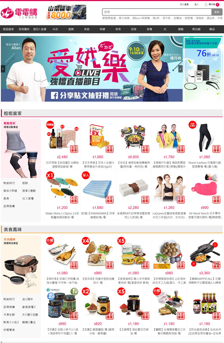 姐姐當家、美食鳳味、婆媳當家、健康有方等三立電視節目,為回應廣大觀眾的建議與需求,為您實現電視里的美好生活,特別成立「電電購」專屬您的電視電商平臺。姐姐當家、美食鳳味、婆媳當家、健康有方等節目里的內衣、鍋子、器具、保養品、保健食品等,都可以在電電購輕松買到!電電購商品皆由多年經驗的專業開發人員挑選審議,為您追蹤最新流行、最好品質、最優價格的商品,電視看得到,電電購買得到!