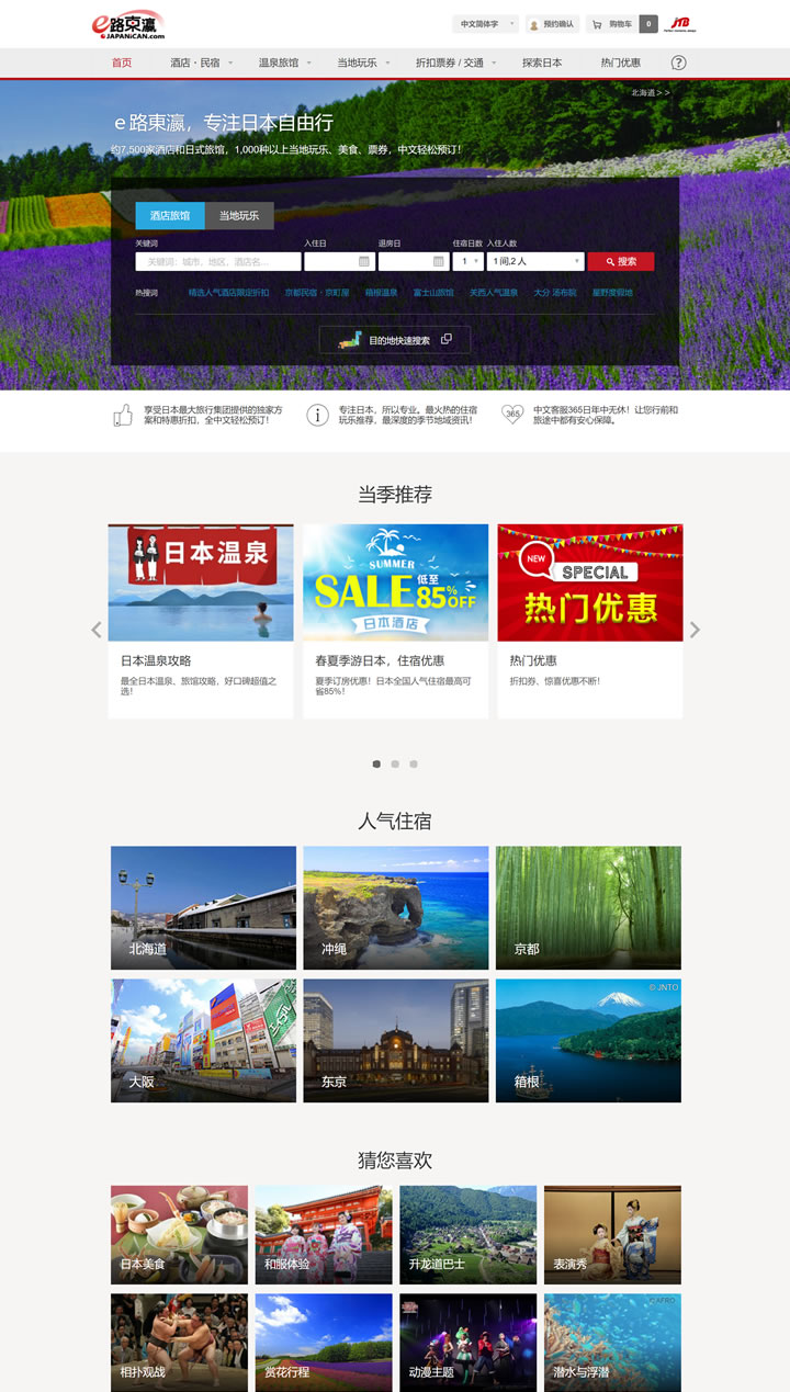 e路東瀛-JAPANiCAN.com是日本國內旅行公司特別面向海外市場所開設的日本最大級旅行商品預約網站。由日本擁有最長歷史、規模最大的JTB旅行公司集團旗下的株式會社JTB所運營。擁有酒店、日本當地跟團游、日本當地行程套裝等多樣化的商品,并以優惠的價格提供給海外游客。我們的業務主旨為:全心協助旅客打造一生難忘的日本旅行。