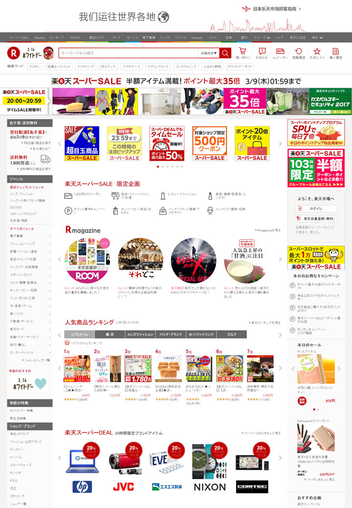 日本最大的購物網站,綜合購物中心,購買食品、家電、時裝、嬰兒用品、化妝品、電子產品等。