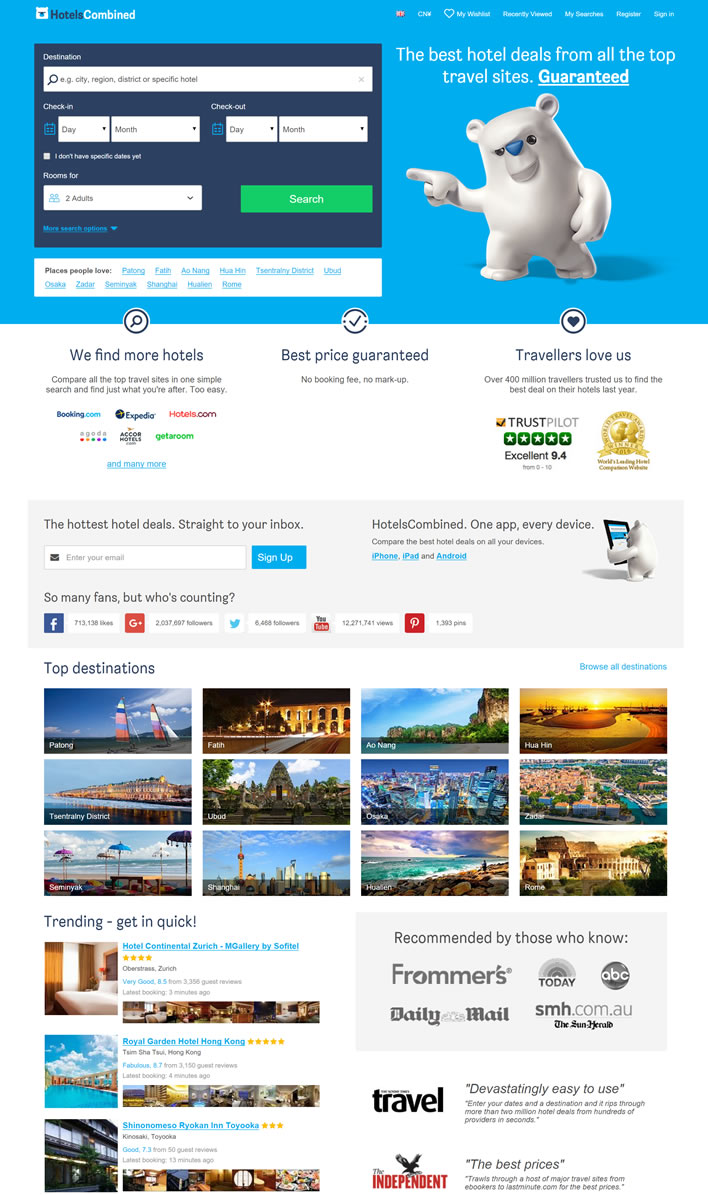 HotelsCombined由Hotels Combined Pty Ltd公司于2005年創立于澳大利亞悉尼 ,是一個覆蓋全球酒店的訂房搜索引擎,通過它可以同步搜索和比較數十個全球最大的酒店預訂網站上的酒店客房信息,可以了解各大旅行網站提供的相關價格以及是否可以預訂,從而找到最適合自己而又經濟實惠的酒店房間。