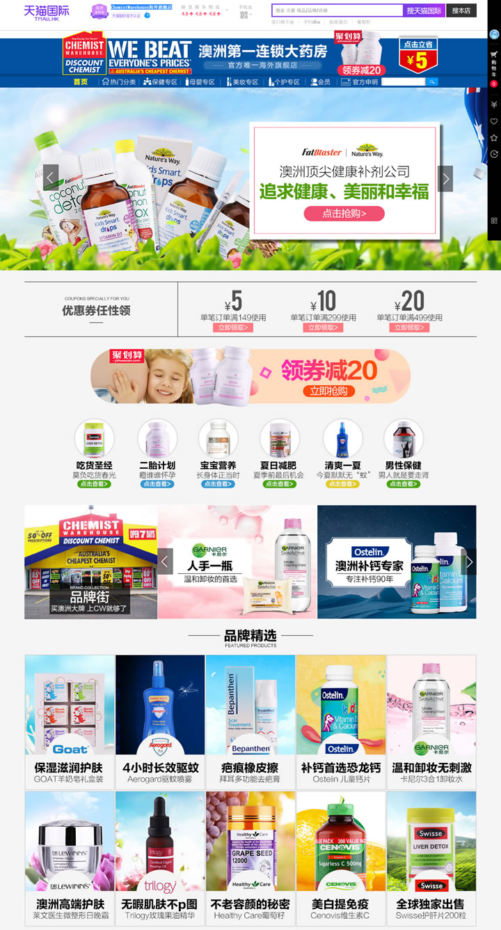 Chemist Warehouse是澳大利亞的藥店連鎖企業(yè),成立于1973年,在澳大利亞擁有370家藥店,共10000多名員工。主營營養(yǎng)保健品、護(hù)膚品、彩妝、香水、嬰兒食品、嬰兒用品、洗護(hù)清潔、藥品等,有藥房界costco之稱。2015年9月22日晚,天貓國際與澳洲大藥房Chemist Warehouse雙方正式在北京簽署獨(dú)家戰(zhàn)略合作協(xié)議,Chemist Warehouse宣布,將于2015年“雙11”前在天貓國際正式開店。