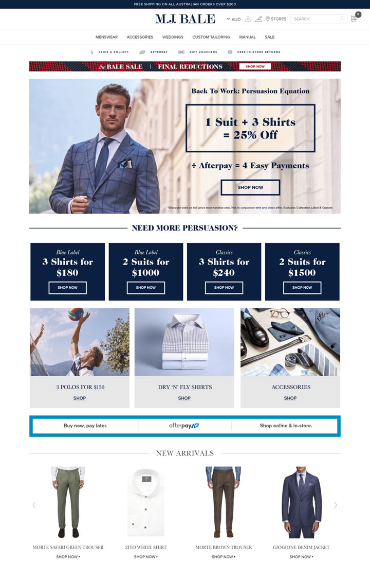 M.J.Bale是一個澳大利亞男裝品牌,也是2014巴西世界杯澳大利亞國家足球隊服裝贊助商。M.J.Bale為挑剔的紳士們提供量身定制的男士西服、燕尾服、外套、長褲、襯衫以及更多男士時裝。該品牌利用一系列全球工匠 – 從澳大利亞美利奴羊毛制造商到意大利紡織大師 – 提供最高質量的產品。