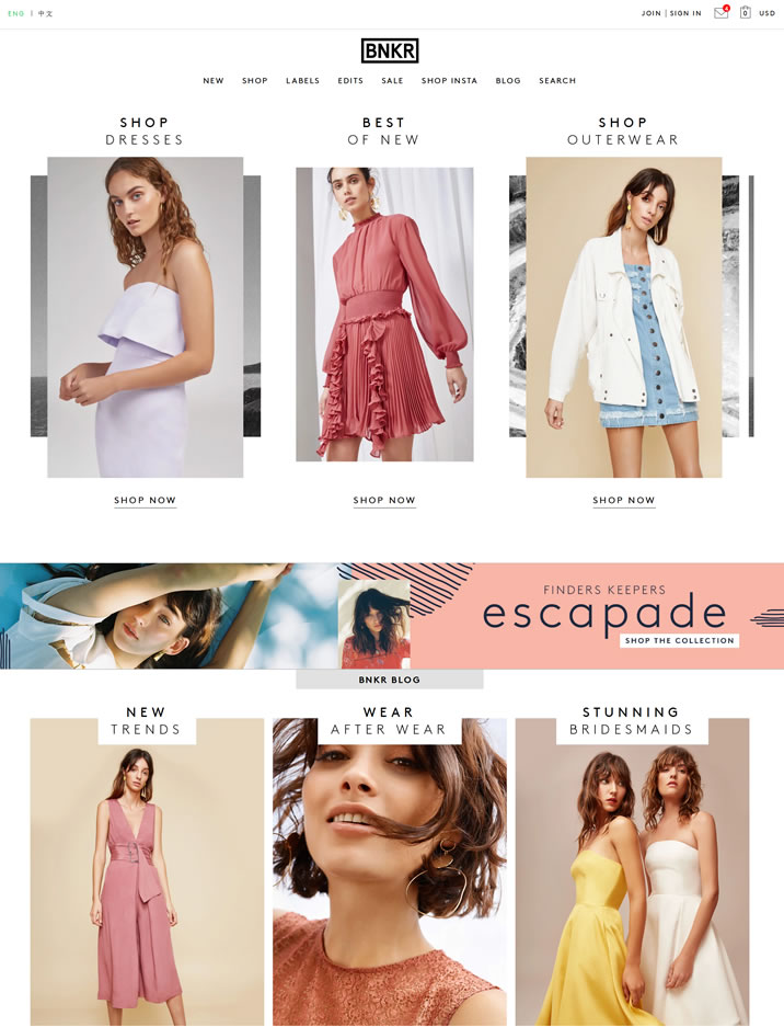 BNKR帶你感受澳洲領先潮流時尚。BNKR是全球唯一一家集合C/MEO COLLECTIVE, Finders, Keepsake及The Fifth Label全部系列的零售商。無論你喜歡街頭潮流還是女性化的優雅,亦或者你不拘一格尋求新鮮獨到的設計,都可以在BNKR找到適合你的的服飾,飾品及鞋履。通過搭配不同的時尚單品,打造出與眾不同的個人風格。