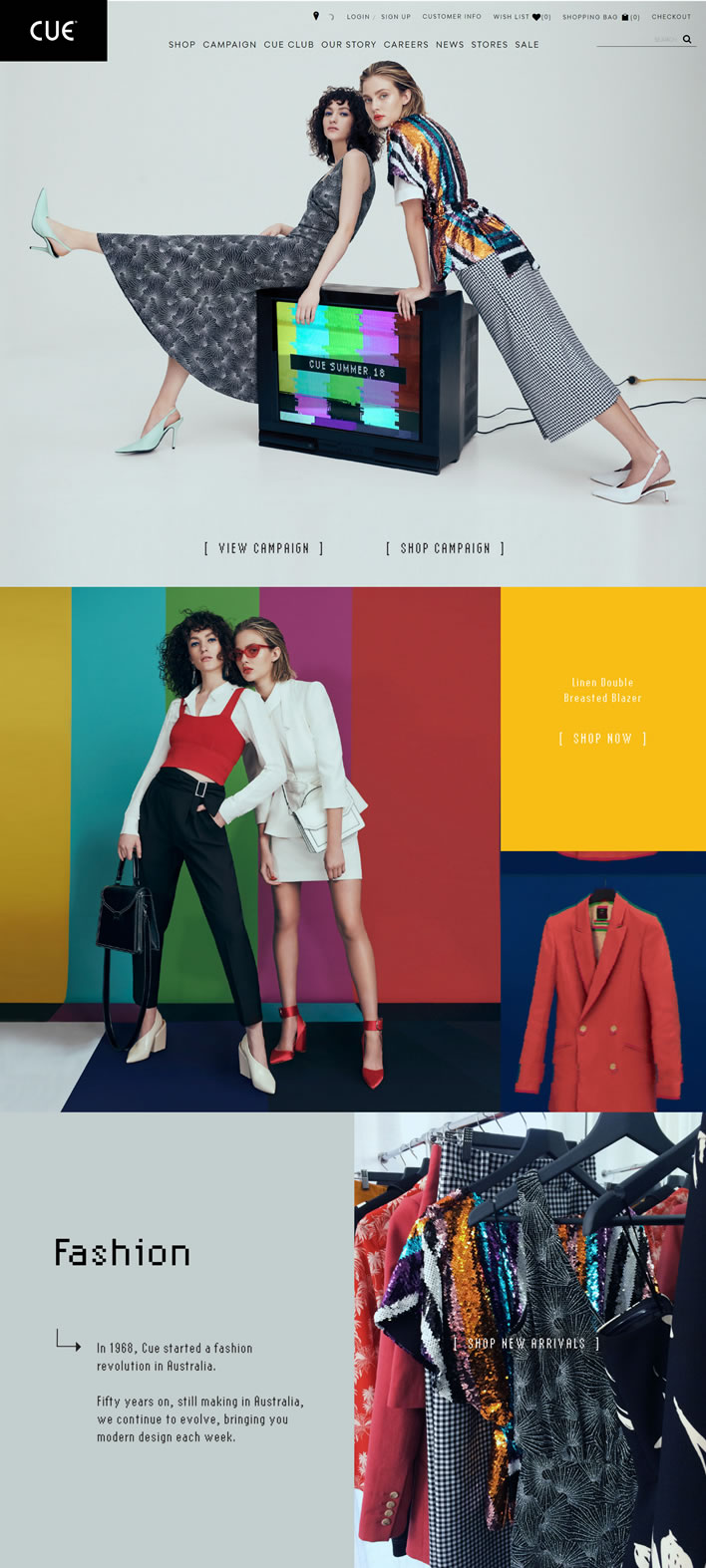 Cue是澳大利亞最受矚目的時尚品牌,以創意和創新為設計的重點,Cue標志是鮮明的剪裁和奢華的面料。Cue是澳大利亞當地最大的時裝生產商。