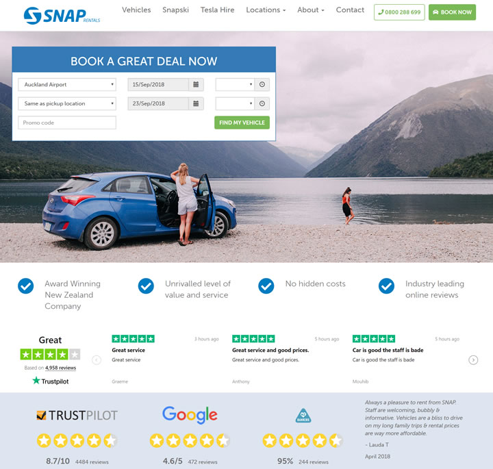 Snap Rentals擁有奧克蘭、基督城和皇后鎮最便宜的汽車租賃。經濟和全新的汽車以具有競爭力的價格。24/7路邊援助,范圍廣泛,自行車架租用,沒有年齡限制,基本保險包括在內。