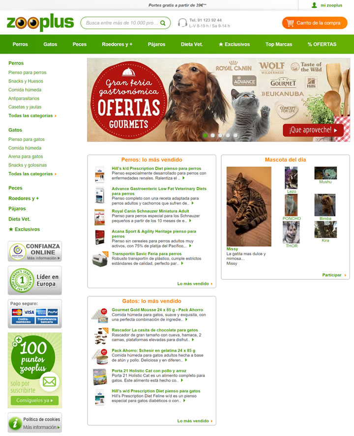zooplus – 歐洲和西班牙在線寵物商店領導者,為狗、貓和小動物提供便宜的飼料、濕糧及配件。39€免費送貨。