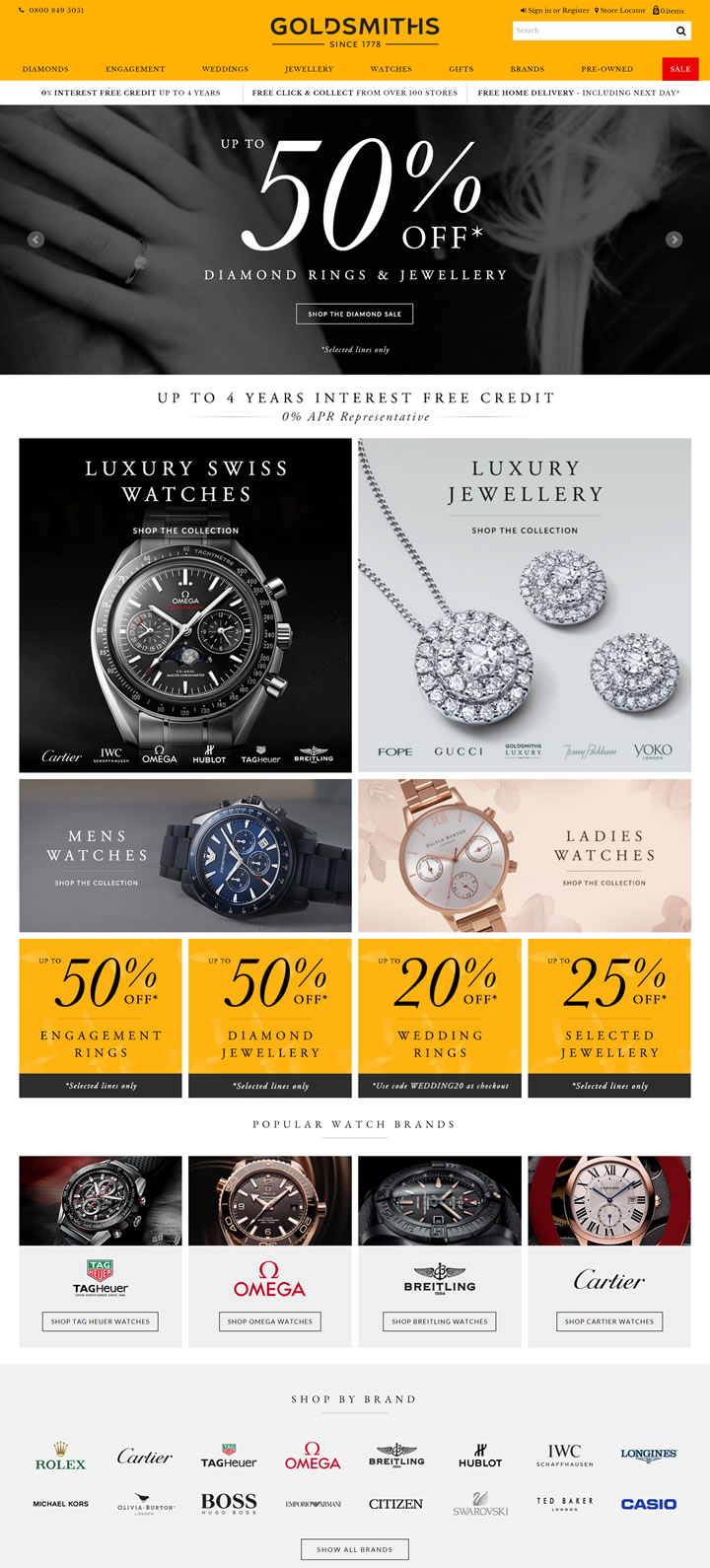 Goldsmiths是英國最大的高品質珠寶和手表專家,自1778年以來一直進行交易,超過110個商業街展示廳。Goldsmiths是世界上最受歡迎的珠寶和手表品牌最大分銷商,包括Omega、TAG Heuer和Michael Kors。