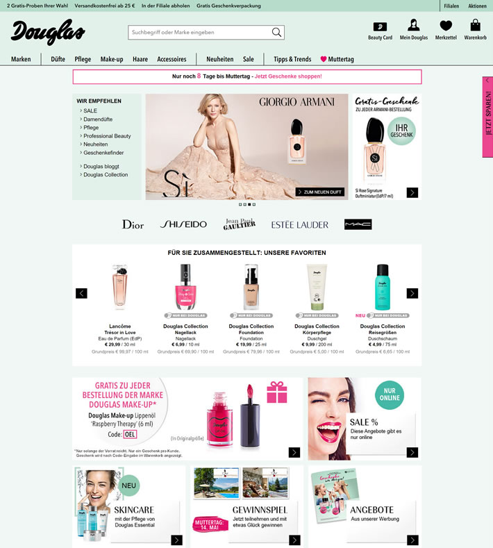 Douglas道格拉斯是歐洲最大的化妝品連鎖公司,在德國及歐洲各大城市都能發現他們的專營連鎖店,是目前德國化妝品市場擁有最大份額的化妝品公司。該集團主要經營香水和化妝品等,是德國人民最愛逛的街頭美妝店。其網店自上線以來,以優勢的價格和精益的服務贏得了大批的消費者青睞。在德國下單3天內不僅能收到包裝精美的禮盒以及大量的贈品,高效高質的服務讓他深得人心。