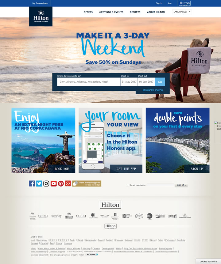 遍及90個國家和地區的逾4,000家酒店,包括希爾頓酒店,華爾道夫酒店,康萊德酒店,希爾頓逸林和希爾頓花園酒店等10大品牌。歡迎加入希爾頓榮譽客會 (Hilton Honors),尊享會員專屬禮遇!令您喜賺積分與里程,更快獲得免費住宿!