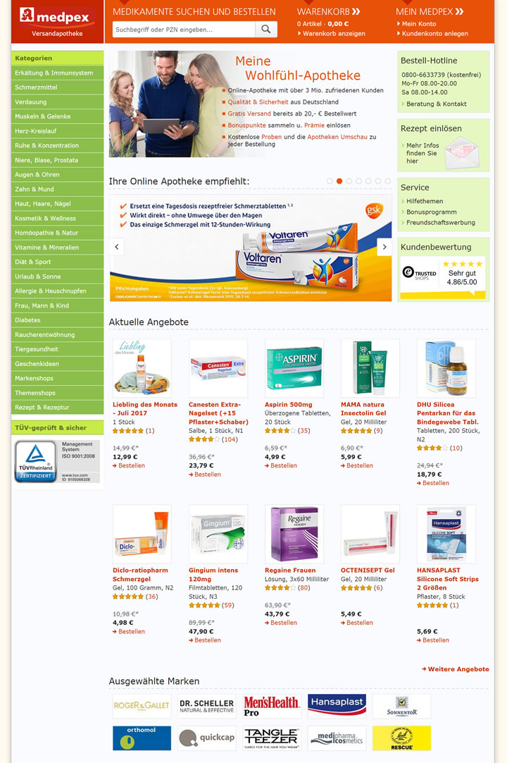 在眾多德國藥品網站中,Medpex主打高性價比。共有止痛藥、肌肉及關節、心血管、眼耳、牙科和口腔、傷口處理、美容與健康、維生素和礦物質、飲食與運動、動物健康等專區。購物可以獲得積分,用于下次兌換禮品。付款方式包括信用卡、PayPal在線支付等。