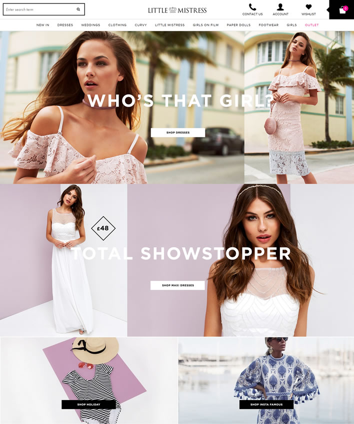 Little Mistress是英國當(dāng)今女生極愛的一個品牌,尤其是她家的美裙~日常穿搭的正裝裙,趴體聚會的蕾絲裙,甜美俏皮或是性感嫵媚,隨你挑選任你搭配。這個品牌旗下的服裝,由富有層次感的紋理、獨特的印花圖案以及具備點睛效果的女性化魅力設(shè)計細(xì)節(jié)構(gòu)成。以華麗復(fù)古的連衣裙為最大賣點,同時保證極高性價比,將T臺上最火熱的潮流單品變成可供日夜穿著的時尚衣飾,這就是Little Mistress。