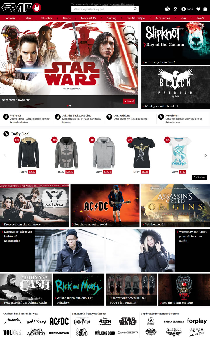 EMP是歐洲第一的搖滾和金屬樂隊服裝及音樂、電影、電視和電子游戲商品在線零售商之一。來自數百個樂隊、品牌和特許加盟店的20000多件商品!
