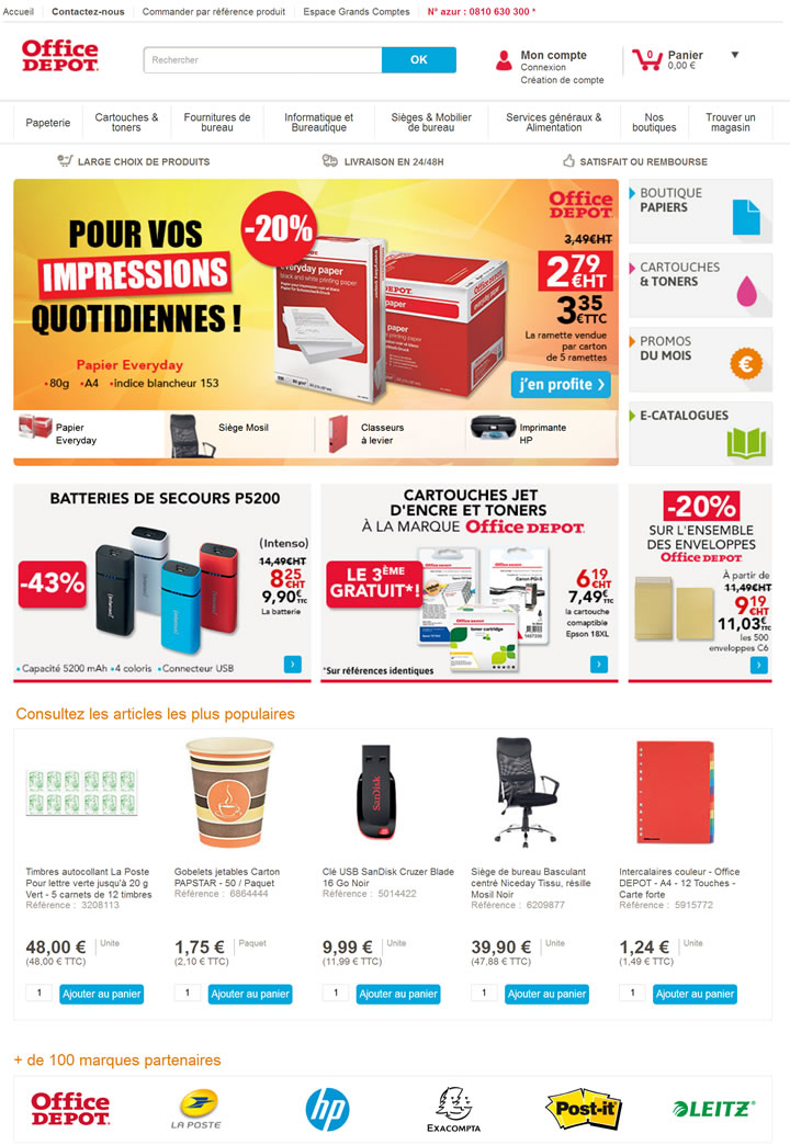 Office DEPOT成立于1986年,是法國、歐洲和全球最大的辦公用品經銷商之一。在法國有43家商店,通過互聯網提供郵購服務。我們提供各種各樣的辦公用品包括惠普、佳能和愛普生噴墨墨盒和激光墨粉,廣泛的辦公家具和辦公椅,紙張和學習用品等。