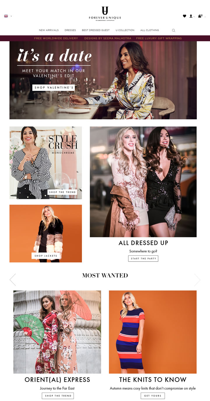 Forever Unique成立于2008年,為特別場(chǎng)合提供超越平凡穿著的理想,為英國(guó)最出名高街品牌。在短時(shí)間內(nèi)就成為了英國(guó)時(shí)尚零售業(yè)的一顆明星,超過(guò) 500 家獨(dú)立零售商及相關(guān)零售集團(tuán)都銷(xiāo)售我們的產(chǎn)品。