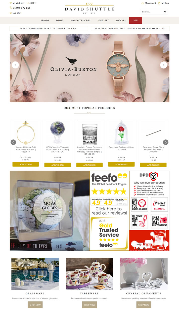 David Shuttle Ltd是一家傳統的家族經營零售商,總部位于英格蘭白金漢郡的比肯斯菲爾德市鎮。我們在比肯斯菲爾德的中心有兩家商店:珠寶鐘表精品店和家居禮品精品店。在2008年,我們推出了我們的網站,提供同樣多元化的價格競爭力的品牌產品,包括最新的收藏品和有選擇性的罕見的受歡迎的作品。