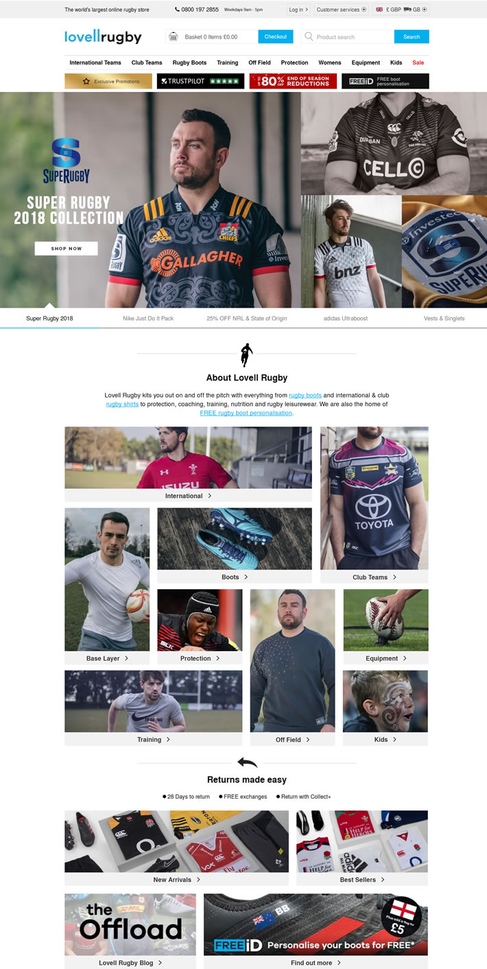 Lovell Rugby是領先的在線橄欖球商品零售商之一,提供包括官方橄欖球復制品襯衫、英國和愛爾蘭獅子橄欖球裝備、橄欖球靴、橄欖球裝備、隊服、教練設備,來自頂級品牌,包括:Nike、adidas、Kooga、Under Armour、Canterbury、Puma、Gilbert、Reebok和Umbro。
