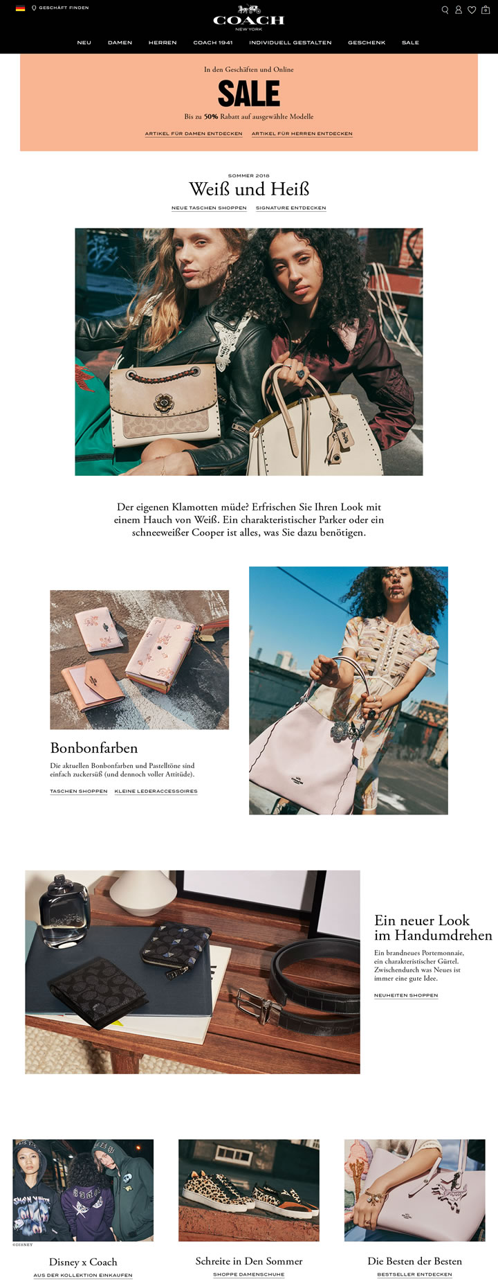 蔻馳,1941年誕生。總部位于紐約。COACH是美國高端生活方式時尚品牌,為男士、女士提供精致配飾與禮品,產品系列包括女士手袋、男士包款、男士及女士小皮具、鞋履、服飾、手表、旅行用品、圍巾、太陽眼鏡、香水、時尚首飾等。COACH的產品透過品牌精品店、指定百貨公司、專門店及官方網站在全球發售 。