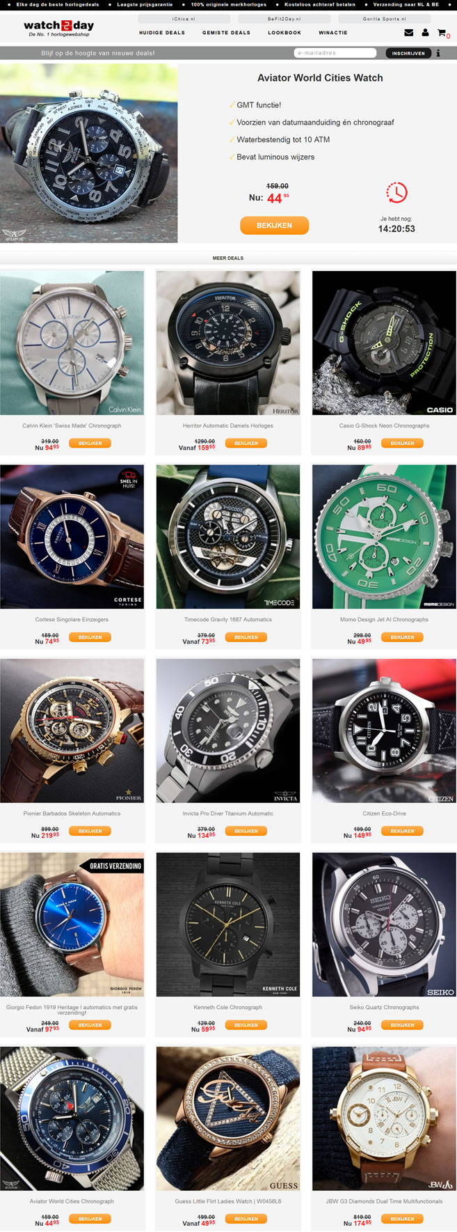 Watch2Day是荷蘭和比利時最大的在線手表供應商,提供低于零售價格的品牌手表,主要目標群體是年齡在18至65歲之間的男性。